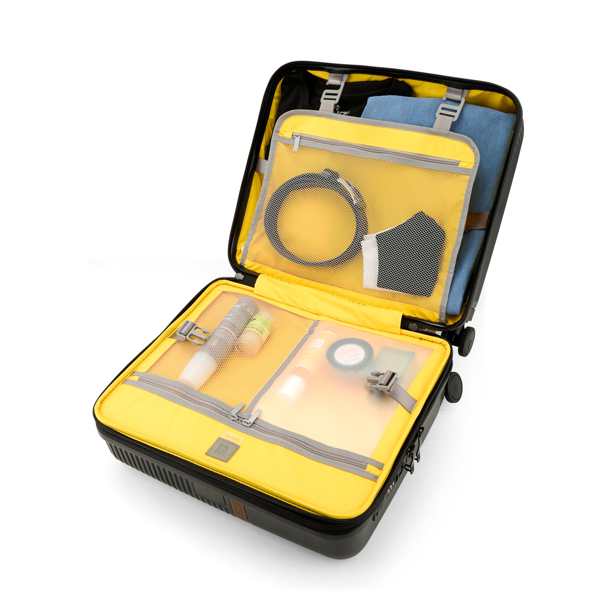 Travel is effortless with Hinomoto Japan silent-run wheels and an anti-theft zipper. Security is paramount with the integrated TSA lock, which also includes A & C type charging slots and a power bank pocket with internal wiring to keep your devices powered.