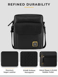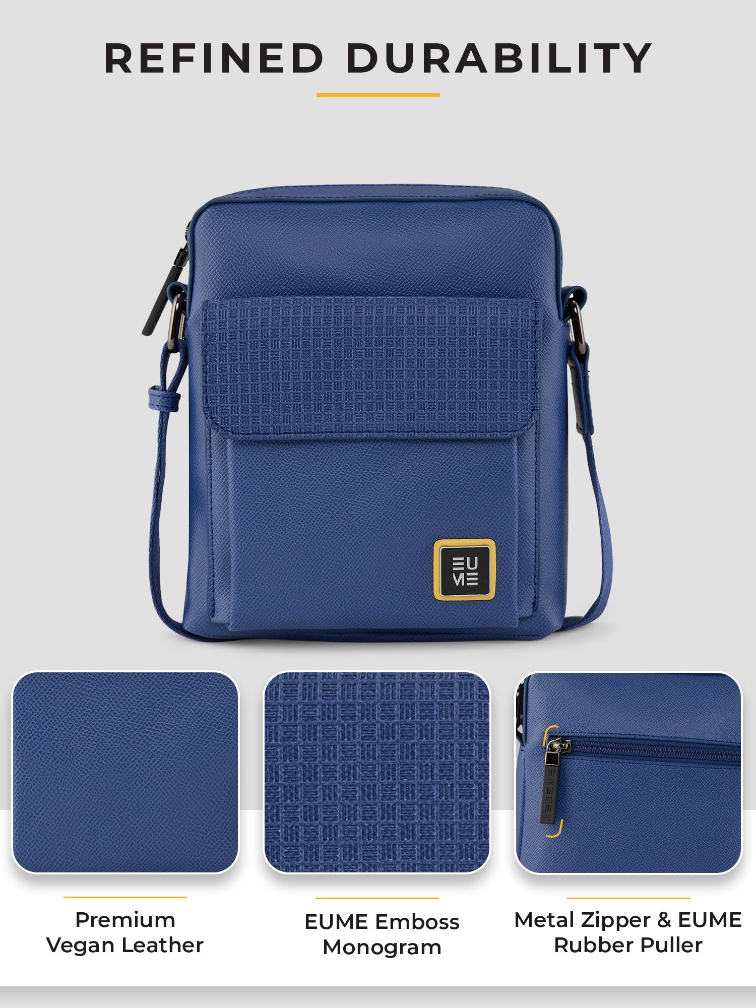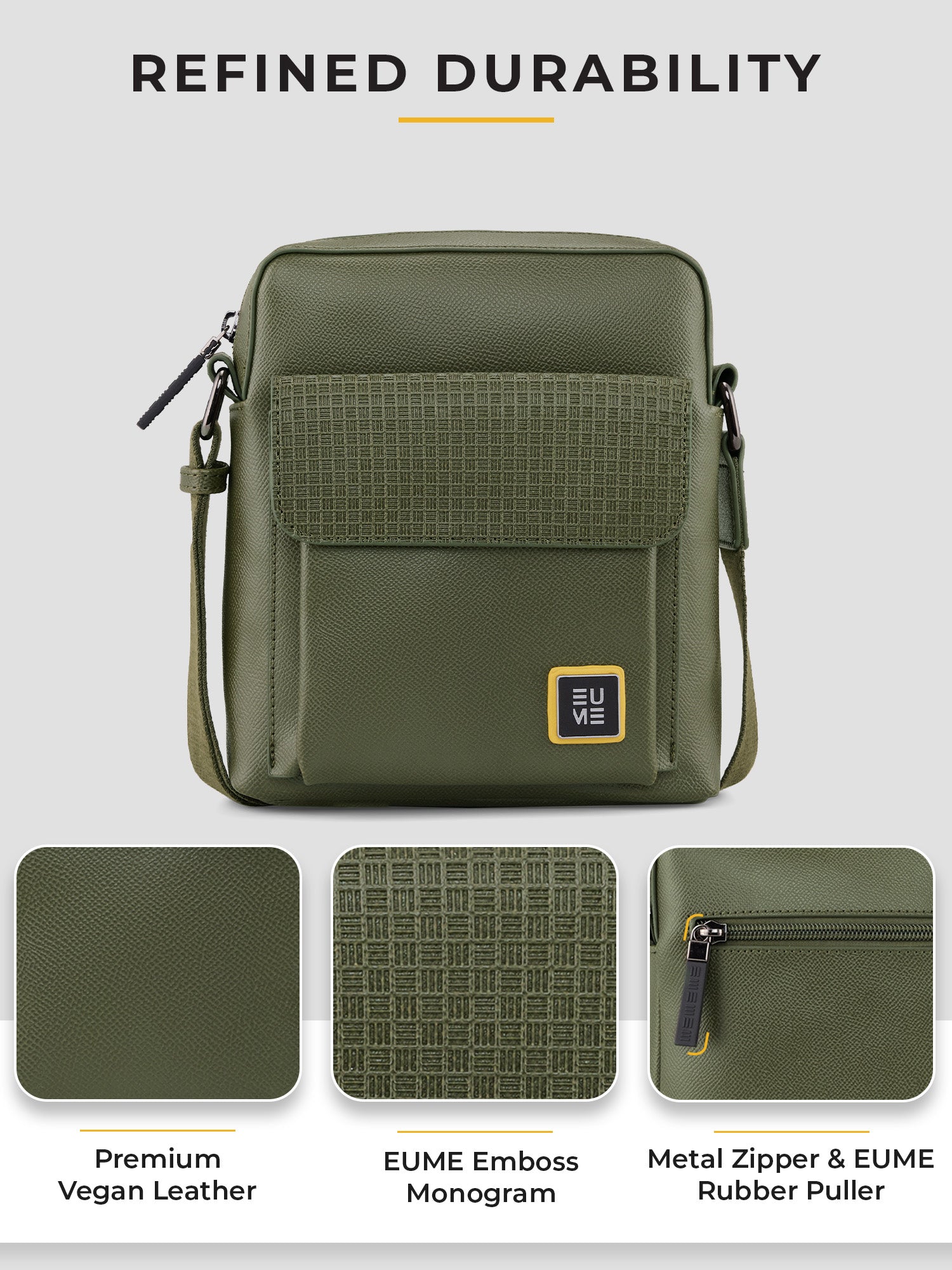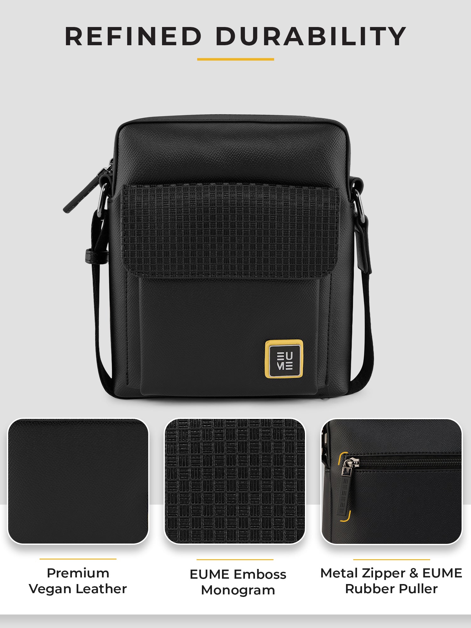 Crafted from premium vegan leather, the Packsy sling bag offers refined durability with a consciously made finish. The exterior is accented with the signature EUME embossed monogram, while metal zippers and branded rubber pullers add a polished, premium touch that elevates its everyday appeal.