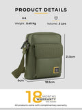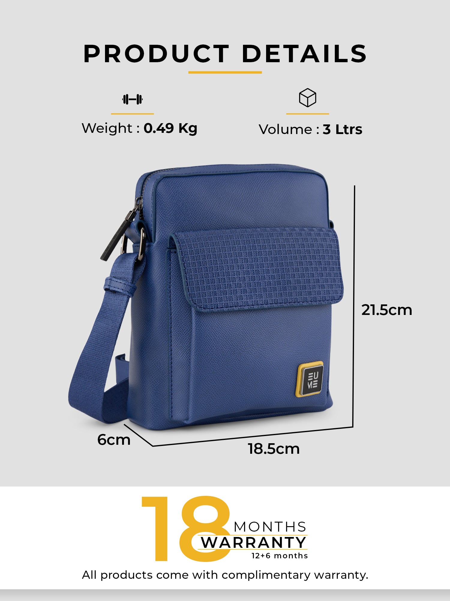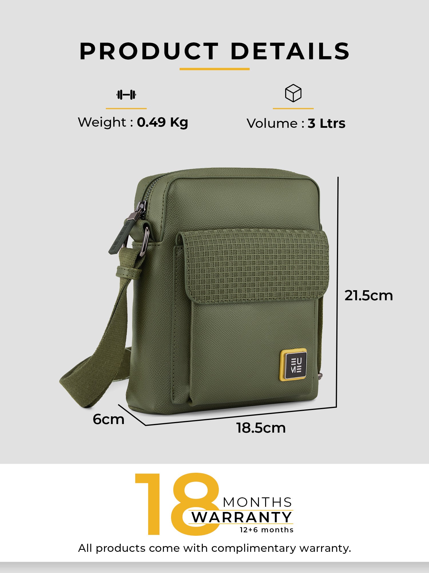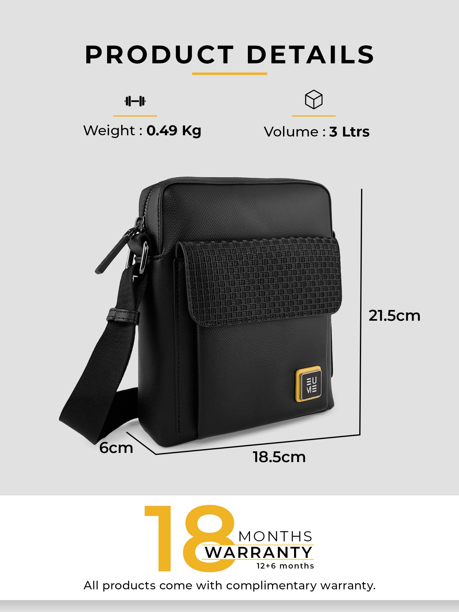 - Dimensions of Sling Bag: 21x10x24.5 cm; Bag Weight: 0.48 Kg; Capacity: 3 liters; Fabric : Vegan Leather & Nylon Fabric .
