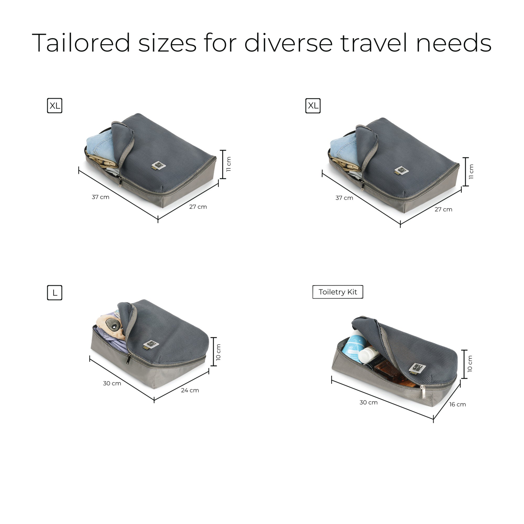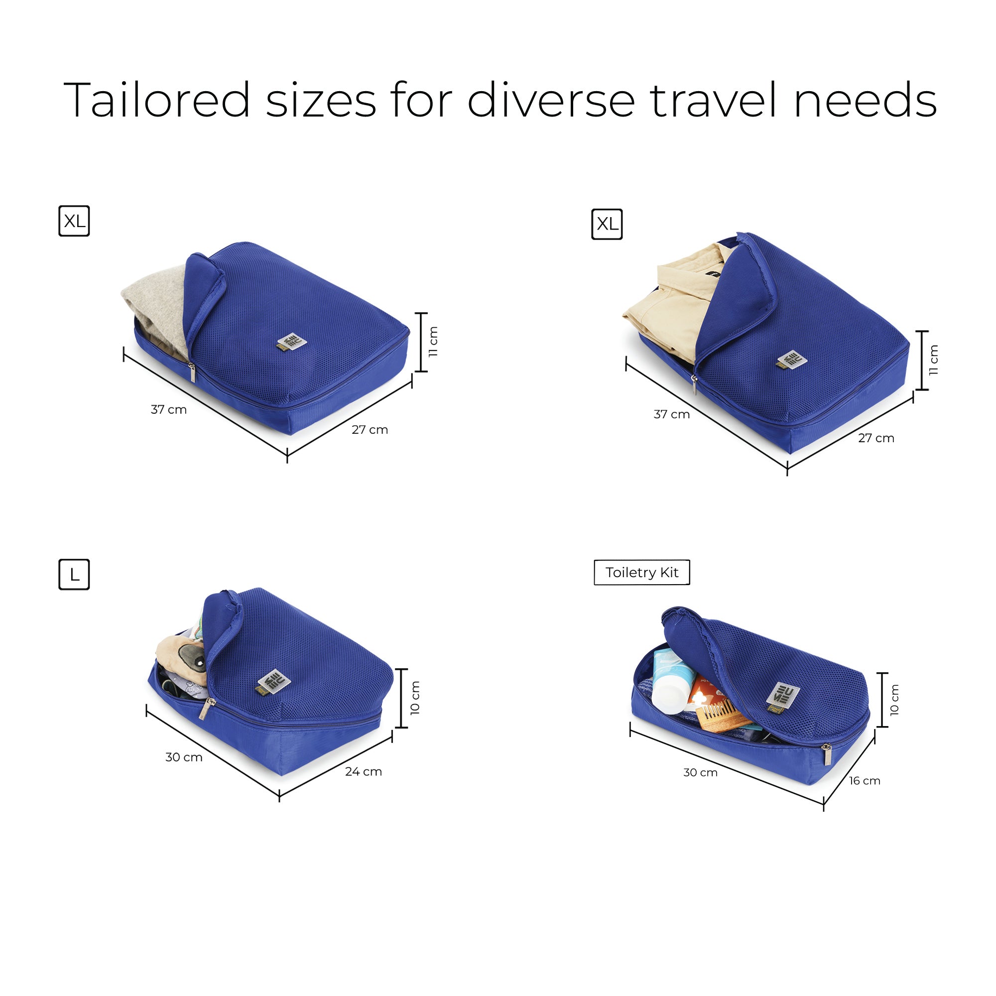 LUGGAGE SET 4 - PIECES DIMENSIONS - Set includes 2 XL packing cubes (37 x 27 x 11 CM), 1 Large packing cubes (30 x 21 x 10 CM), 1 Medium packing cubes (30 x 16 x 10 CM)