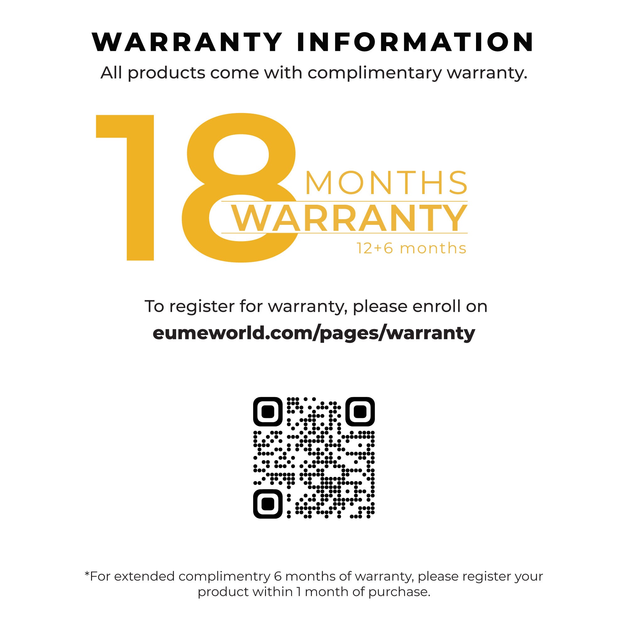 All other products: Including backpacks, handbags, and accessories, come with a 1.5-year extended warranty, with the first year complimentary and an additional 6 months upon registration on our warranty page via https://eumeworld.com/pages/warranty.