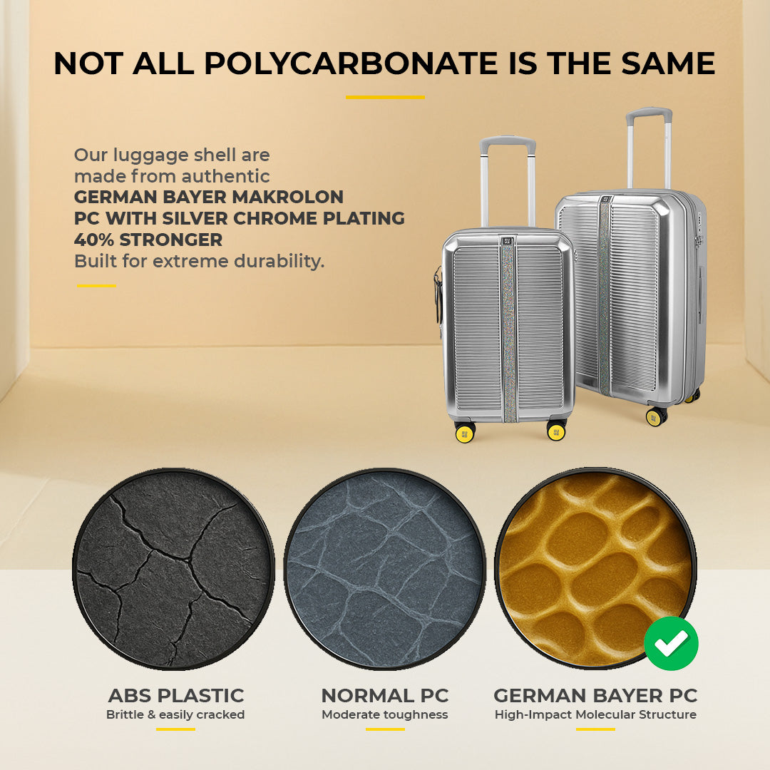 - This premium luggage set, which includes both a 20-inch and a 24-inch bag, is made from 100% German Bayer polycarbonate with a high-gloss finish, offering unmatched durability and a sophisticated look. The vibrant red color symbolizes the beautiful journey you're about to embark on. Adding to its allure, a shimmering silver detail elegantly graces the center, making it truly stand apart and perfect for the bride.