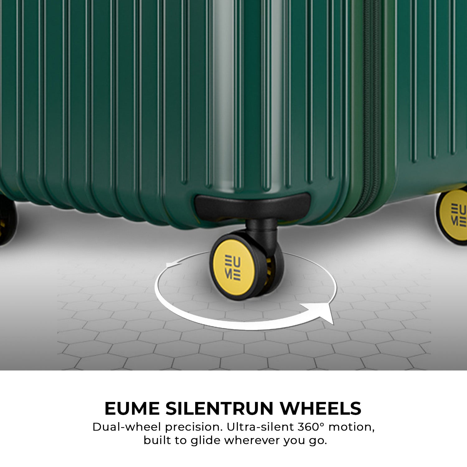 - The EUME Trunk Check-in Plus 26-inch trolley bag large size is meticulously crafted from 100% German Bayer Polycarbonate (PC), known for its durability and lightweight construction. Equipped with smooth EUME SilentRun 360-degree double wheels for stable steering, facilitated by ball-bearing mounted wheels with cushioned axles and TSA-approved locks, it offers secure and effortless travel, ideal for airline baggage inspections.