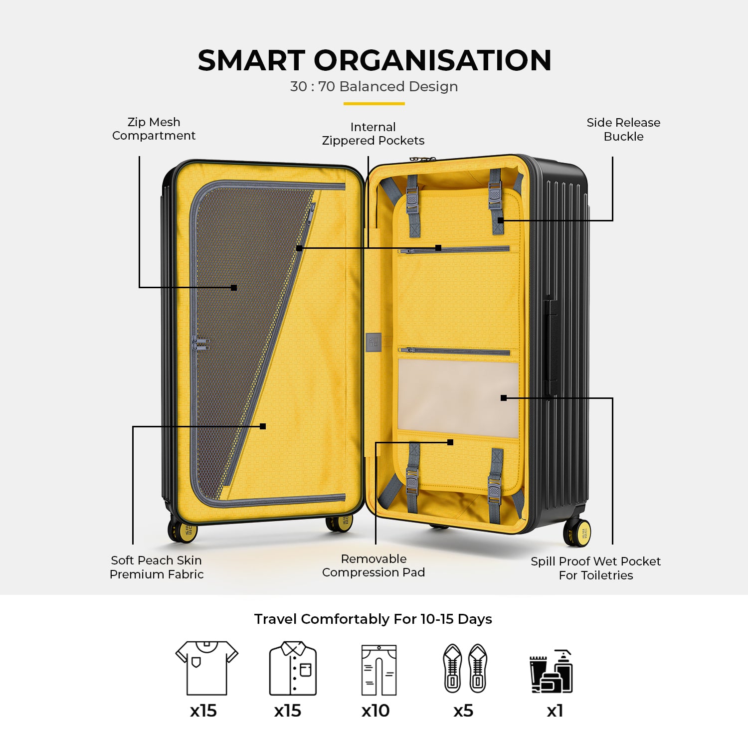 - These polycarbonate trolley bags feature three sturdy handheld handles capable of lifting up to 22kgs, and a premium-quality zippers for reliable closure, ensuring convenience and durability. Further, our luggage trolley can be extended by up to 3 inches, providing more room for extra items when needed.