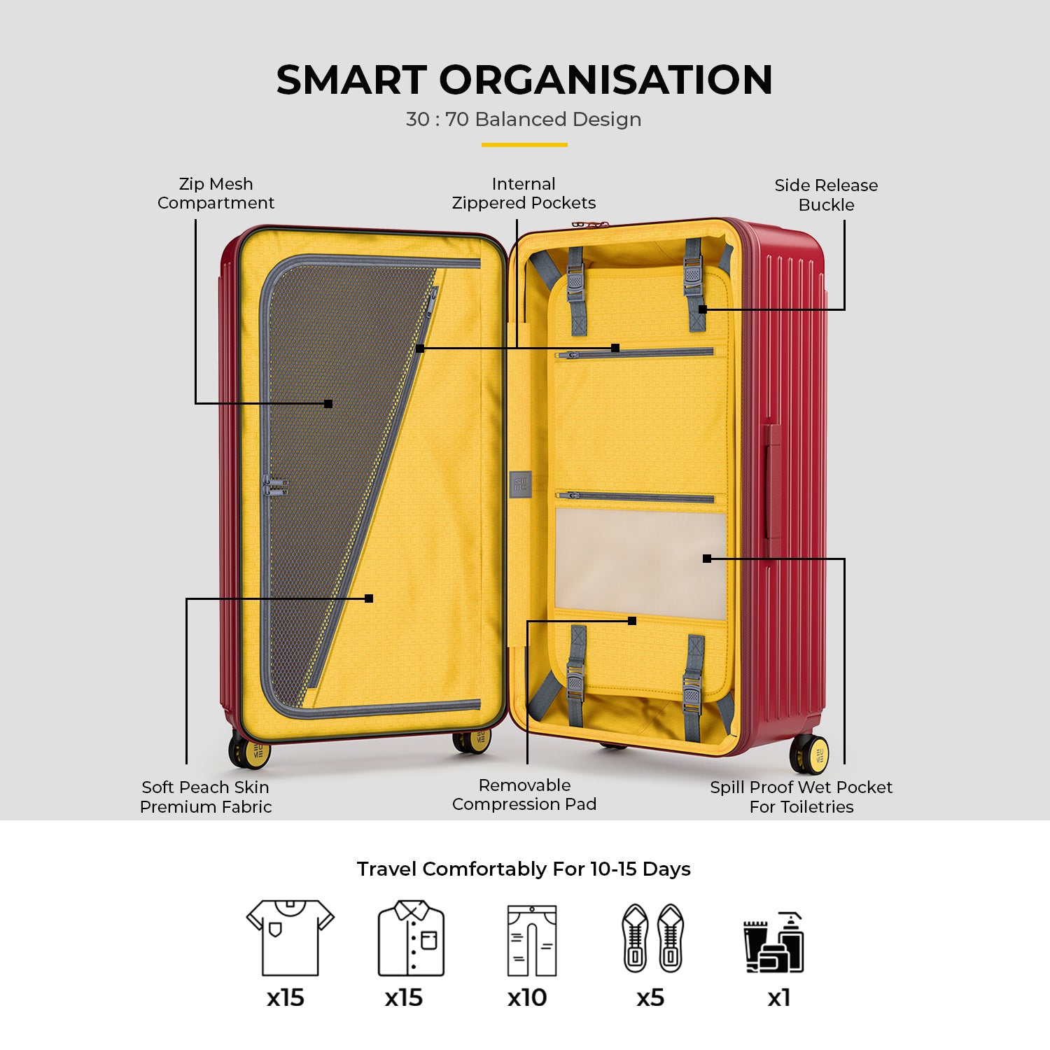 - Two pockets in the compression pad section are perfect for holding necessities like moisturizers, face wash, skincare products, combs, toiletries, lingerie, and socks. In order to hold clothing firmly in place, compression belts are also incorporated. In addition, our travel bag trolley has a telescopic trolley handle designed for smooth, stage-free adjustment, guaranteeing optimal comfort and easy mobility for a hassle-free travel experience.