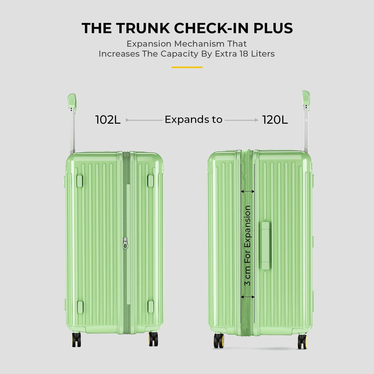 - These polycarbonate trolley bags feature three sturdy handheld handles capable of lifting up to 22kgs, and a premium-quality zippers for reliable closure, ensuring convenience and durability. Further, our luggage trolley can be extended by up to 3 inches, providing more room for extra items when needed.