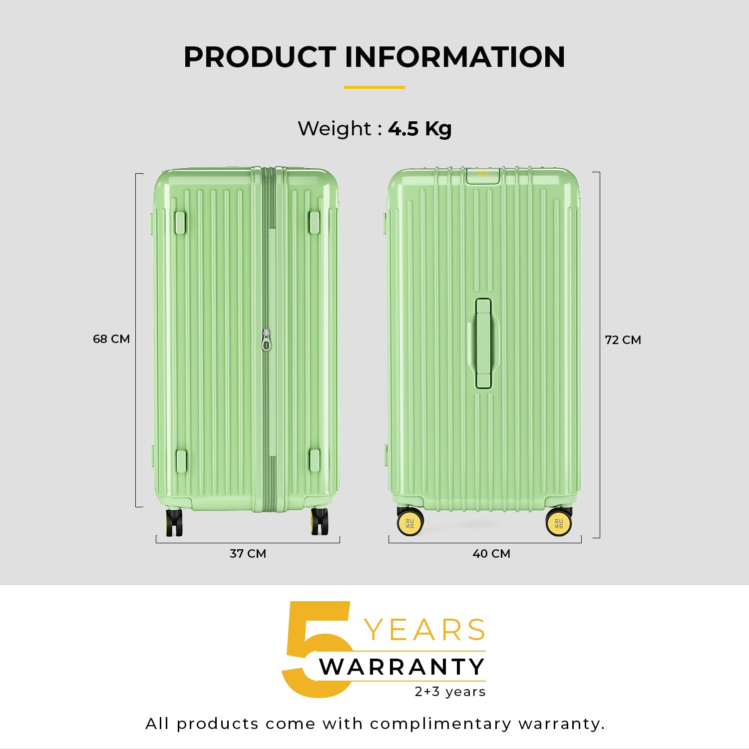 Travel Luggage: Comes with a 5-year extended warranty, with 2 years complimentary and an additional 3 years upon registration on our warranty page via https://eumeworld.com/pages/warranty.