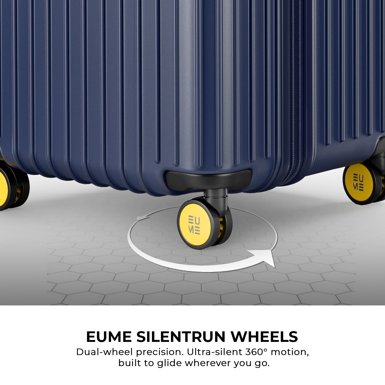 - The EUME Trunk Check-in Plus 26-inch trolley bag large size is meticulously crafted from 100% German Bayer Polycarbonate (PC), known for its durability and lightweight construction. Equipped with smooth EUME SilentRun 360-degree double wheels for stable steering, facilitated by ball-bearing mounted wheels with cushioned axles and TSA-approved locks, it offers secure and effortless travel, ideal for airline baggage inspections.
