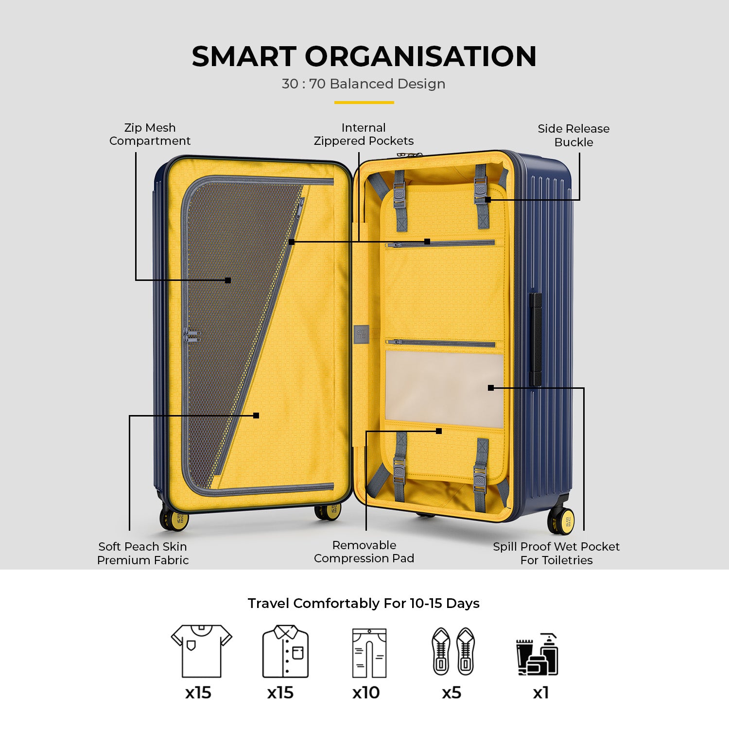- These polycarbonate trolley bags feature three sturdy handheld handles capable of lifting up to 22kgs, and a premium-quality zippers for reliable closure, ensuring convenience and durability. Further, our luggage trolley can be extended by up to 3 inches, providing more room for extra items when needed.