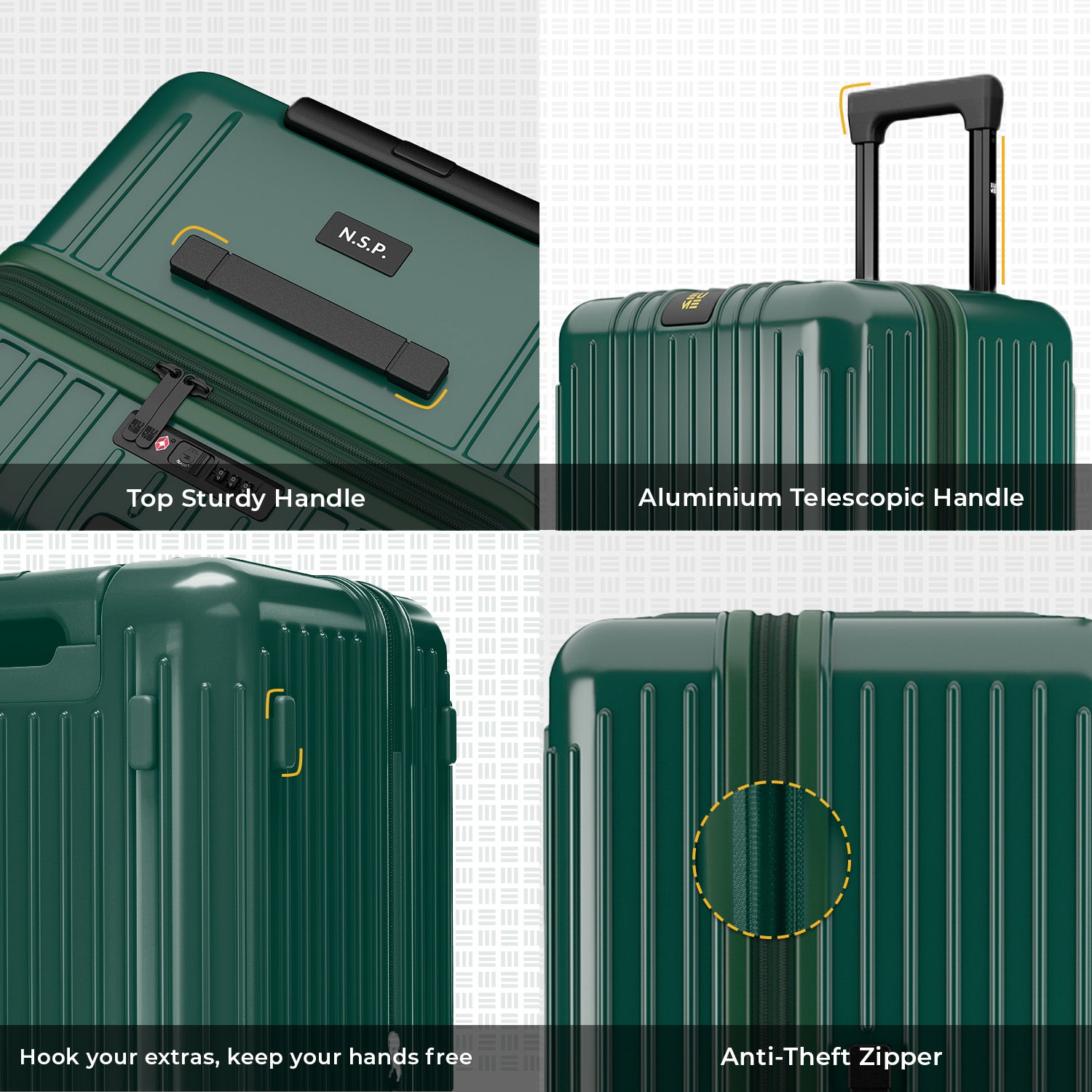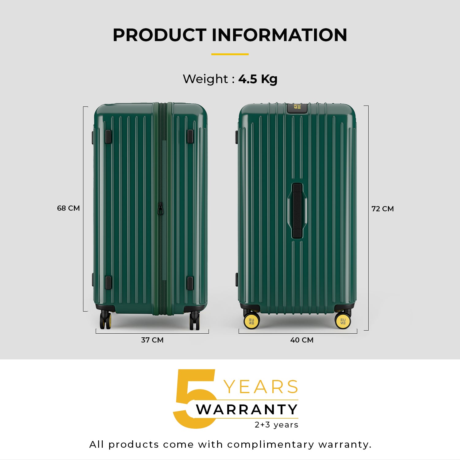 - These polycarbonate trolley bags feature three sturdy handheld handles capable of lifting up to 22kgs, and a premium-quality zippers for reliable closure, ensuring convenience and durability. Further, our luggage trolley can be extended by up to 3 inches, providing more room for extra items when needed.