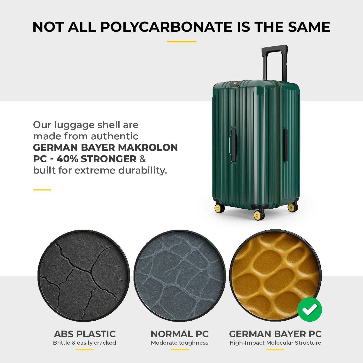 - These polycarbonate trolley bags feature three sturdy handheld handles capable of lifting up to 22kgs, and a premium-quality zippers for reliable closure, ensuring convenience and durability. Further, our luggage trolley can be extended by up to 3 inches, providing more room for extra items when needed.