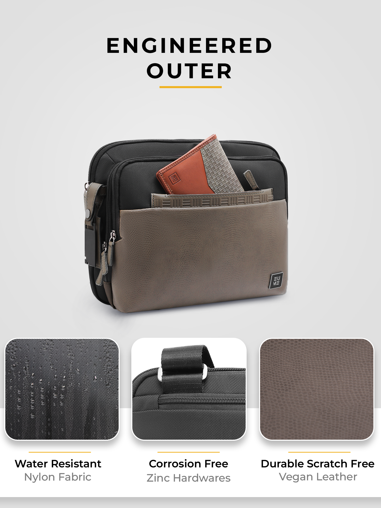 - The EUME Workport Tablet Sling Bag is thoughtfully designed for the modern commuter, combining functionality with refined style. Crafted from waterproof nylon and textured vegan leather, it offers a sleek yet durable build.