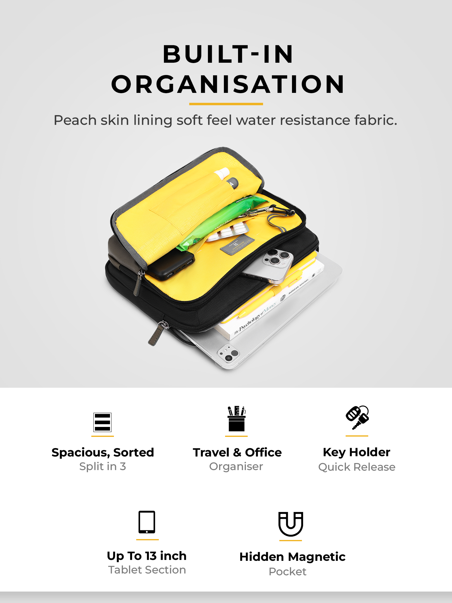 - Nestled between the main and secondary compartments is a hidden magnetic pocket for discreet, secure storage. On the back, a multifunctional compartment doubles as both a zippered pocket and a trolley strap, enhancing travel convenience.
