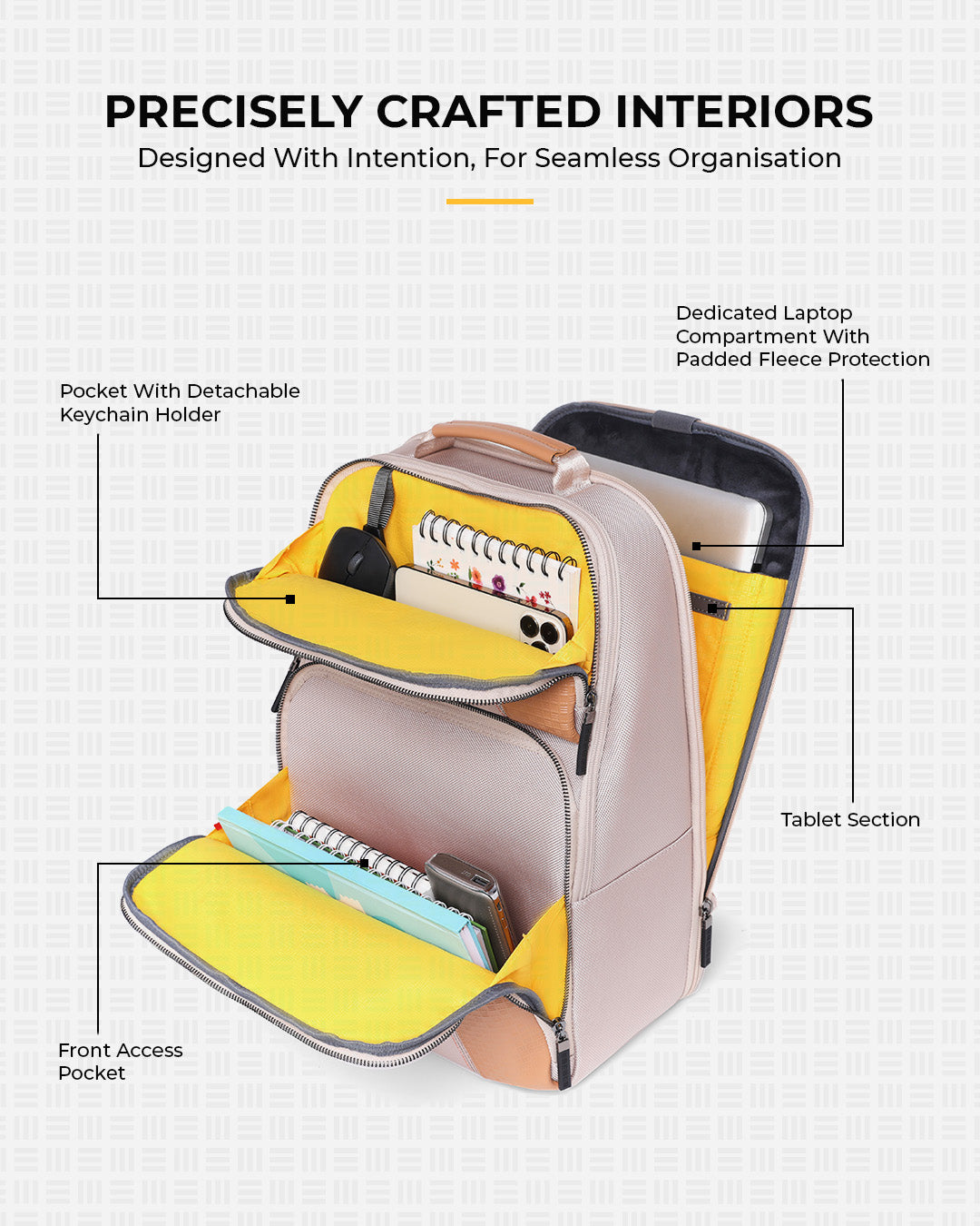 - The interior is lined with EUME’s signature yellow waterproof fabric, offering both style and protection. The first compartment is spacious enough to carry office files, documents, and other daily essentials. It also includes a secure zipper pocket for valuables, along with an elastic loop designed to hold circular items such as small containers, compact umbrellas, or rolled-up accessories. The second compartment is well-padded with a soft fleece-like lining and is designed to securely hold a laptop up to 15.6 inches, along with a tablet—keeping your devices safe during commutes or travel.
