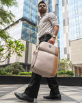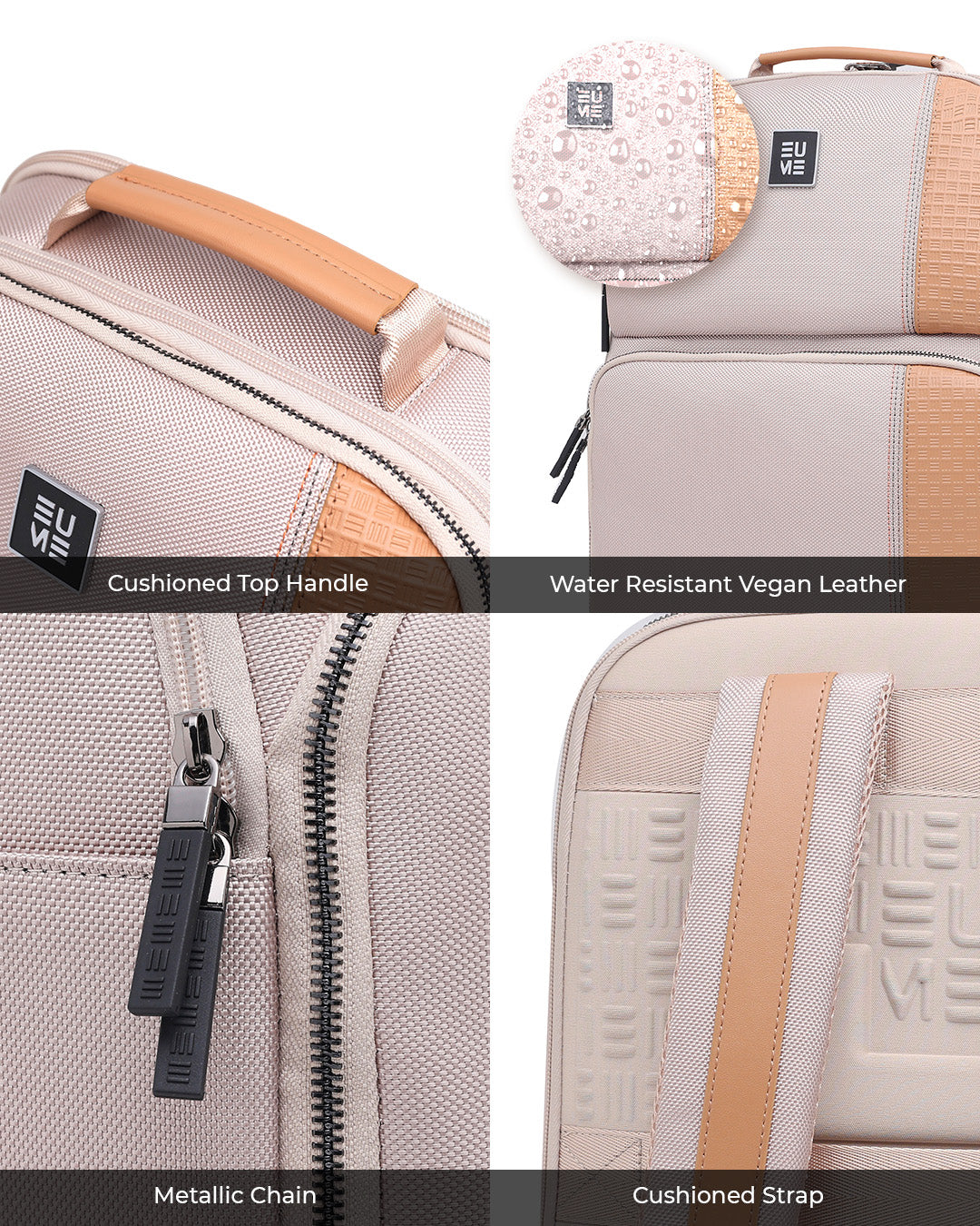 - The EUME Zenith Laptop Backpack is a smart, professional companion designed for the modern working individual. Crafted from high-quality waterproof nylon and premium vegan leather, it presents a sleek and polished look while offering practical functionality. The front section of the bag reflects EUME’s attention to detail, featuring fine stitching lines and a subtle EUME emboss on the vegan leather—showcasing the brand’s dedication to refined craftsmanship. It includes two easy-access front pockets—one at the top with a detachable keychain holder for essentials like your passport, wallet, or office ID, and a lower pocket for organizing notebooks, diaries, chargers, and other work accessories. A convenient side pocket provides space for a water bottle or umbrella.