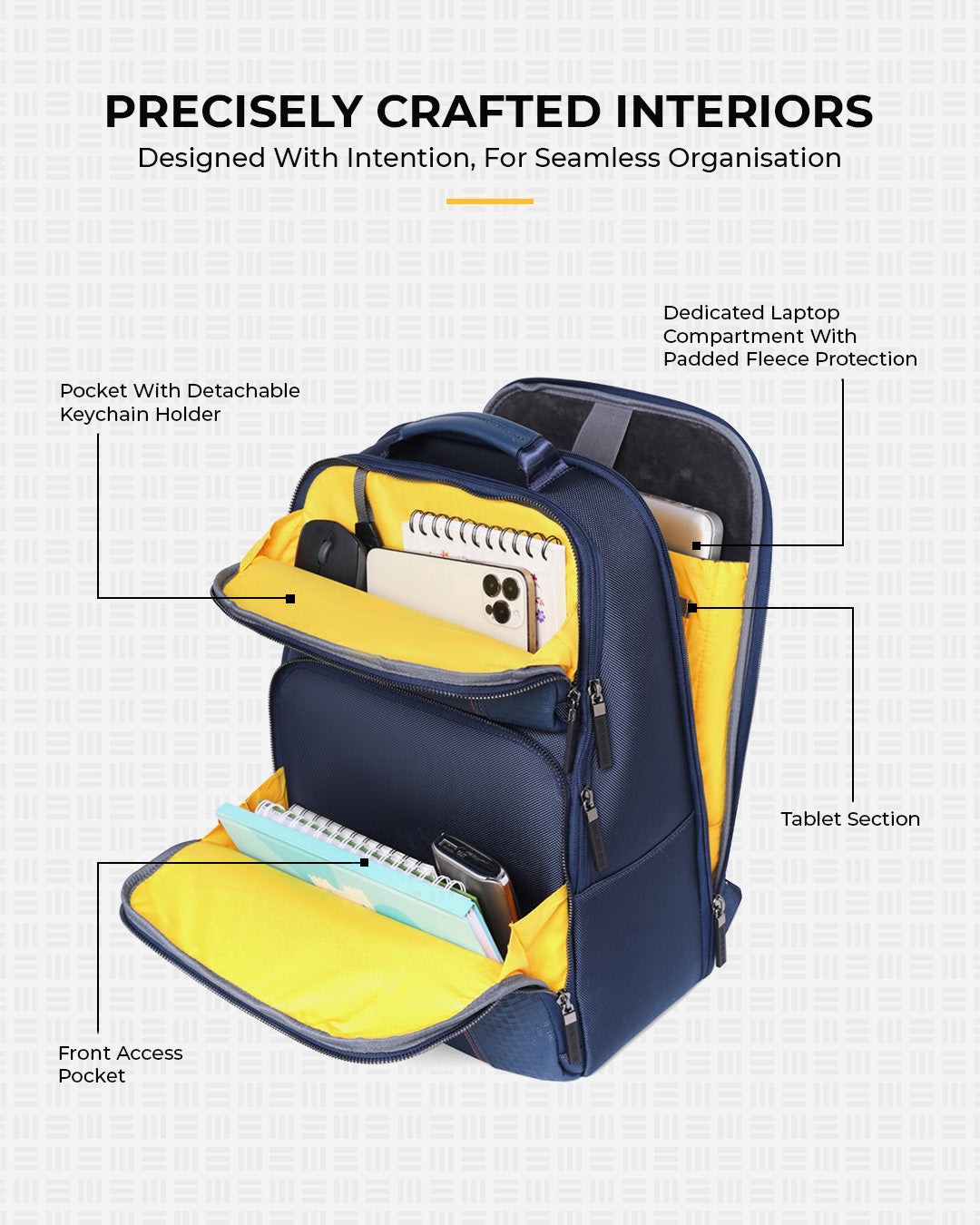 - The interior is lined with EUME’s signature yellow waterproof fabric, offering both style and protection. The first compartment is spacious enough to carry office files, documents, and other daily essentials. It also includes a secure zipper pocket for valuables, along with an elastic loop designed to hold circular items such as small containers, compact umbrellas, or rolled-up accessories. The second compartment is well-padded with a soft fleece-like lining and is designed to securely hold a laptop up to 15.6 inches, along with a tablet—keeping your devices safe during commutes or travel.