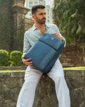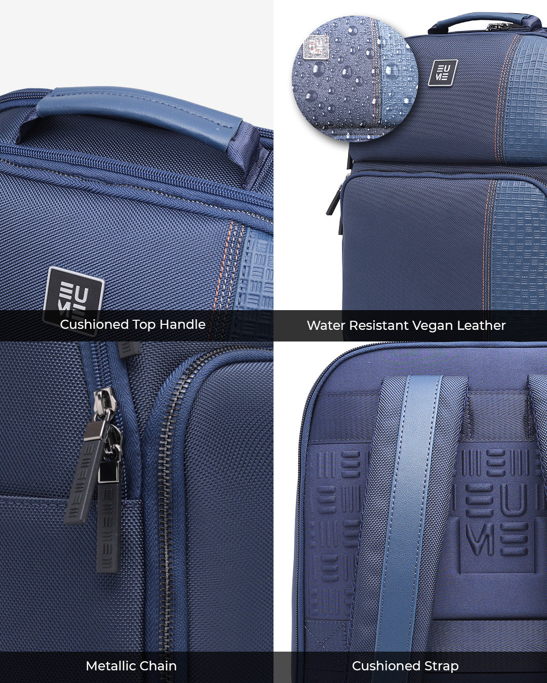 - For added comfort and support, the back panel features an ergonomic EVA structure embossed with the EUME logo, enhancing both grip and style. The shoulder straps are well-cushioned and adjustable, with a breathable mesh underside for all-day wearability. A built-in trolley strap at the back allows you to easily attach the backpack to your luggage handle, making it a reliable partner for business travel.