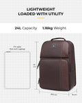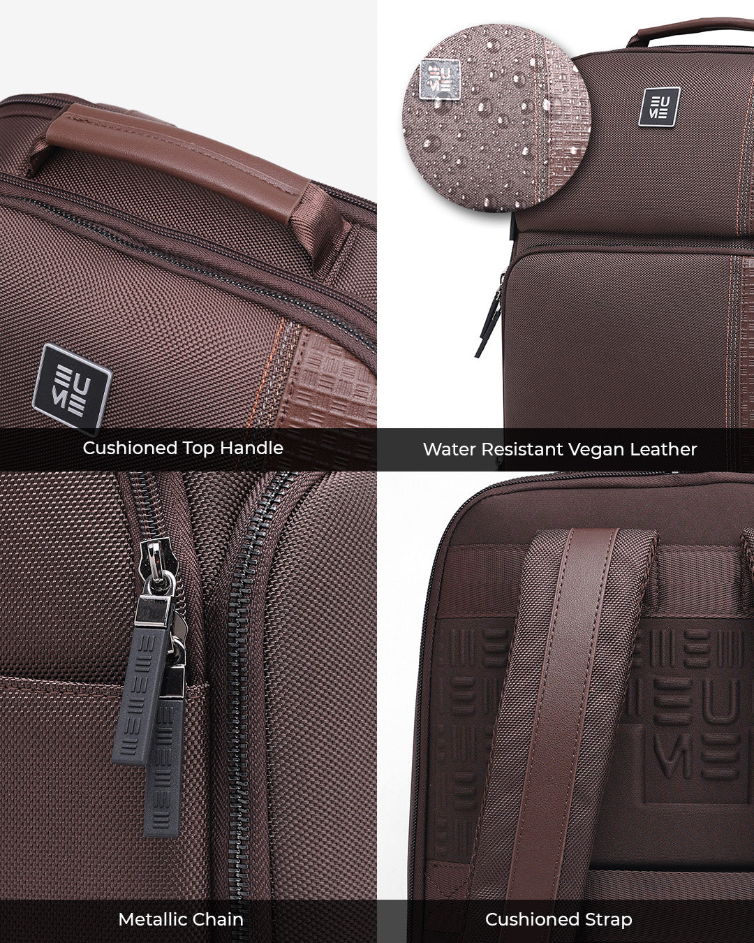 - The EUME Zenith Laptop Backpack is a smart, professional companion designed for the modern working individual. Crafted from high-quality waterproof nylon and premium vegan leather, it presents a sleek and polished look while offering practical functionality. The front section of the bag reflects EUME’s attention to detail, featuring fine stitching lines and a subtle EUME emboss on the vegan leather—showcasing the brand’s dedication to refined craftsmanship. It includes two easy-access front pockets—one at the top with a detachable keychain holder for essentials like your passport, wallet, or office ID, and a lower pocket for organizing notebooks, diaries, chargers, and other work accessories. A convenient side pocket provides space for a water bottle or umbrella.